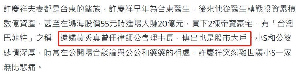 小S的婆婆,也便是三个儿子的奶奶,亦然一位女强东说念主,自己是讼师缔造,和小S公公一同把三个子女皆培养上了名校,说明台媒报说念,小S婆婆名下也有不少钞票,和丈夫同样皆是股市大户。