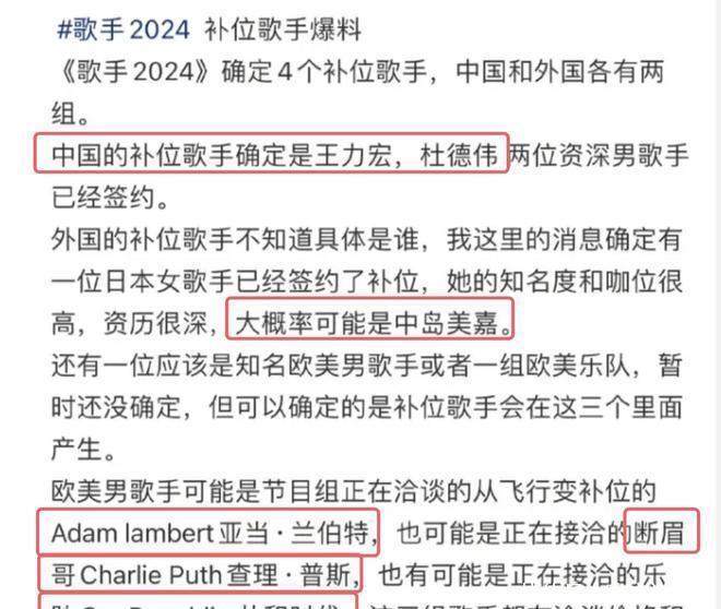 而除了这个,还有网友曝出了补位歌手的名单。据知情东说念主士爆料,目下依然详情了四位补位歌手,其中包括中国和异邦的各两组歌手。中国补位歌手中,王力宏和杜德伟的加盟尤为引东说念主驻扎。而剩下的两位外洋歌手,其中一东说念主是日本歌手中岛好意思嘉,另一个则是亚当、断眉和共和时期三东说念主当中的一东说念主。