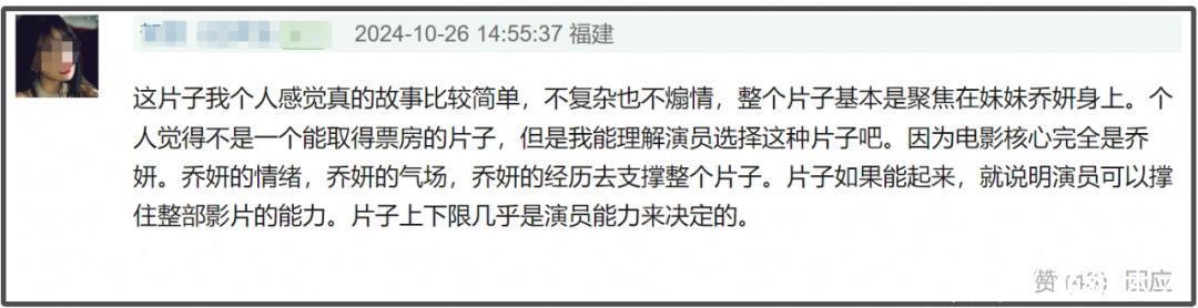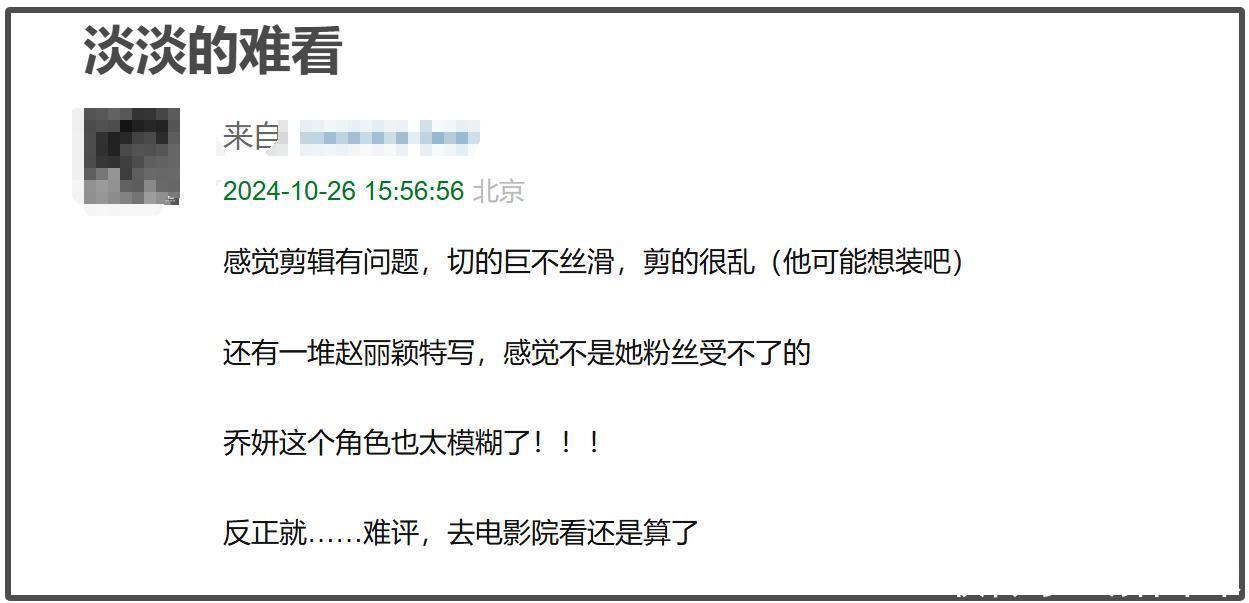 从部分不雅众的反映来看,赵丽颖以往演技中的小过失照旧莫得大改,念念考时目光戏飘忽,愁肠九转时面无表情颦蹙,似乎也曾堕入花样化。固然,也不错看出赵丽颖在这方面也曾很敛迹了,仅仅大荧幕会放大好多细节,赵丽颖后续可能需要不时打磨。