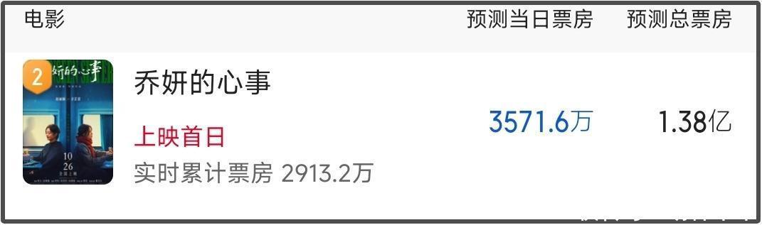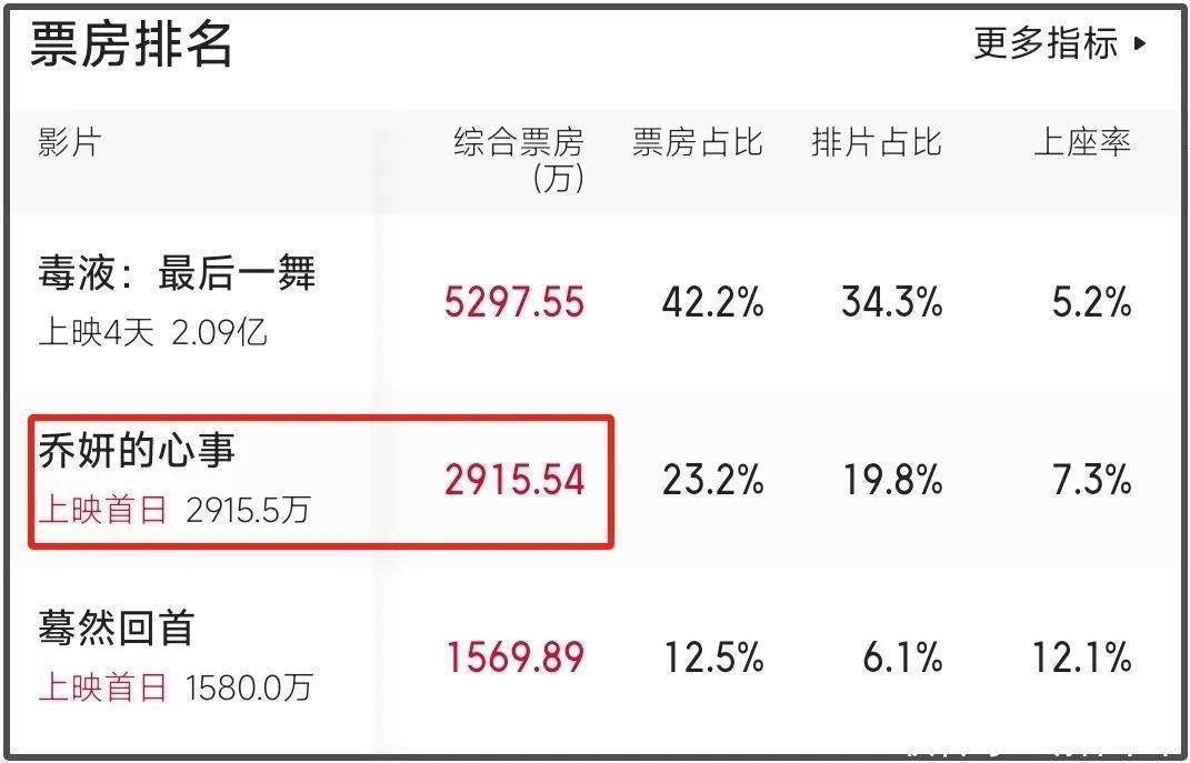 《乔妍的苦衷》上映今日票房排行第二,仅次于好意思国科幻电影《毒液:临了一舞》。该片在上映之前的预售票房打破了两千万,当今当日的票房收货是2900万,而某购票平台给出的预计数据是当日票房3571.6万,总票房1.38亿。这也就意味着,首日票房可能就会占据总票房的四分之一。